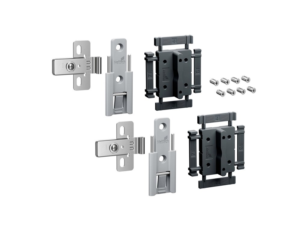 Sada obsahuje 2 stredové skládacie závesy s nastavením výšky a medzery, spojovací materiál a vŕtaciu šablónu pre skladané dvere s 2 krídlami. Farba šedá