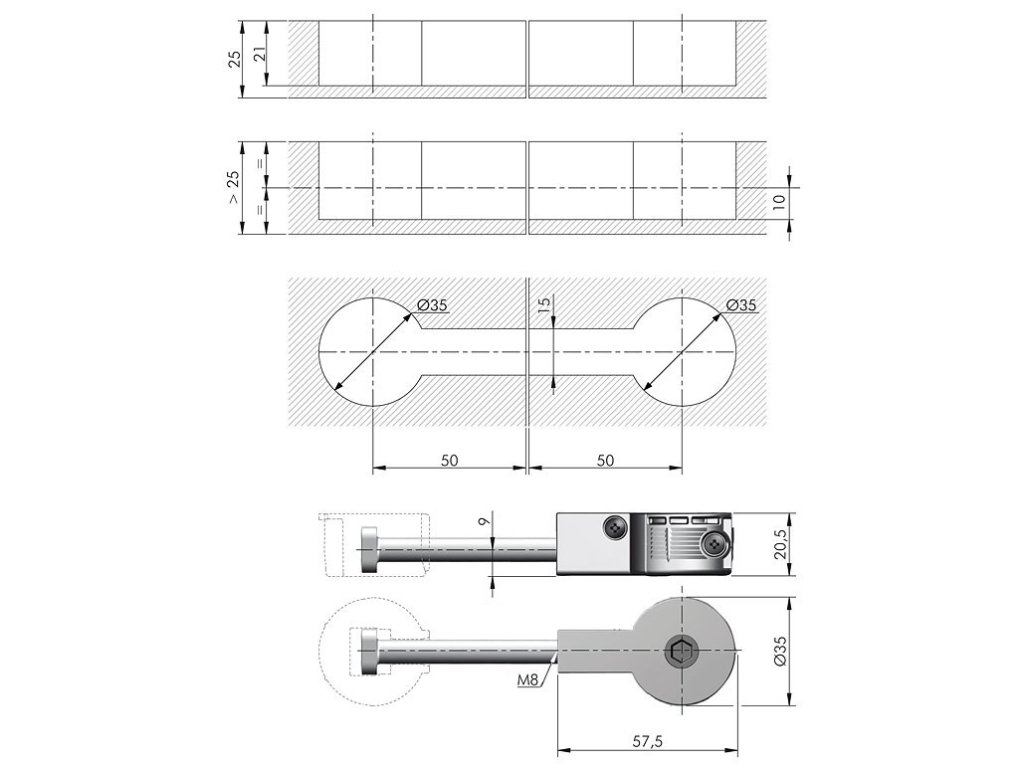 Minimální tloušťka pracovní desky - 25mm.Rozteč (střed.✅ Průměr 35mm) 2x 50 -+ 0✅ 3mm (100mm)✅ Drážka šířka 15mm✅...