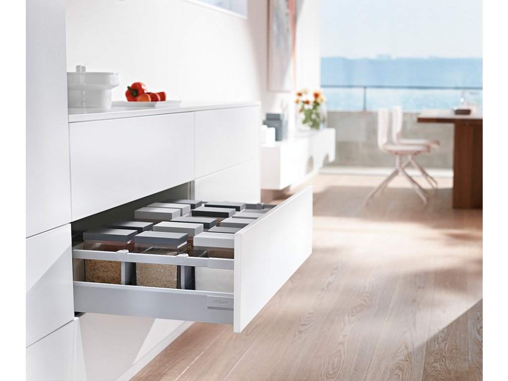 Súprava obsahuje kovanie na montáž jednej tlmenej zásuvky Blumotion vrátane príslušného čelného kovania.