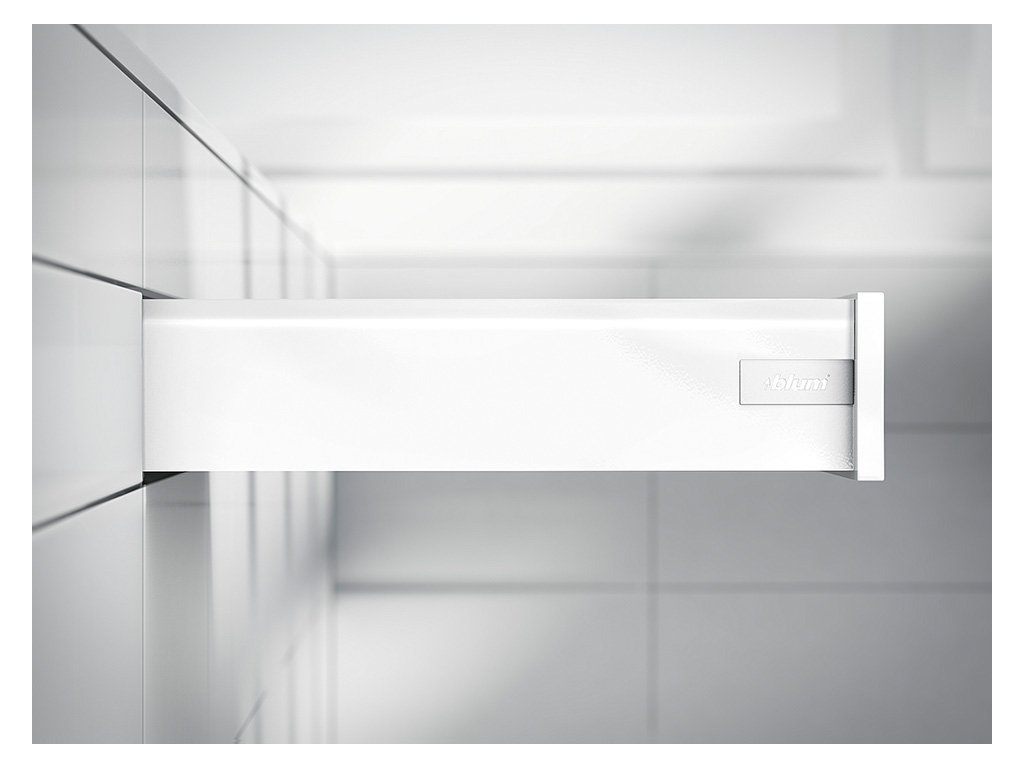 Súprava obsahuje kovanie na montáž jednej tlmenej zásuvky Blumotion vrátane príslušného čelného kovania.