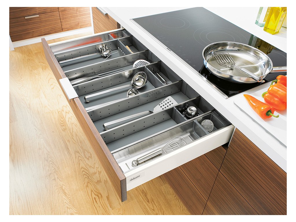 Súprava obsahuje kovanie na montáž jednej tlmenej zásuvky Blumotion vrátane príslušného čelného kovania.