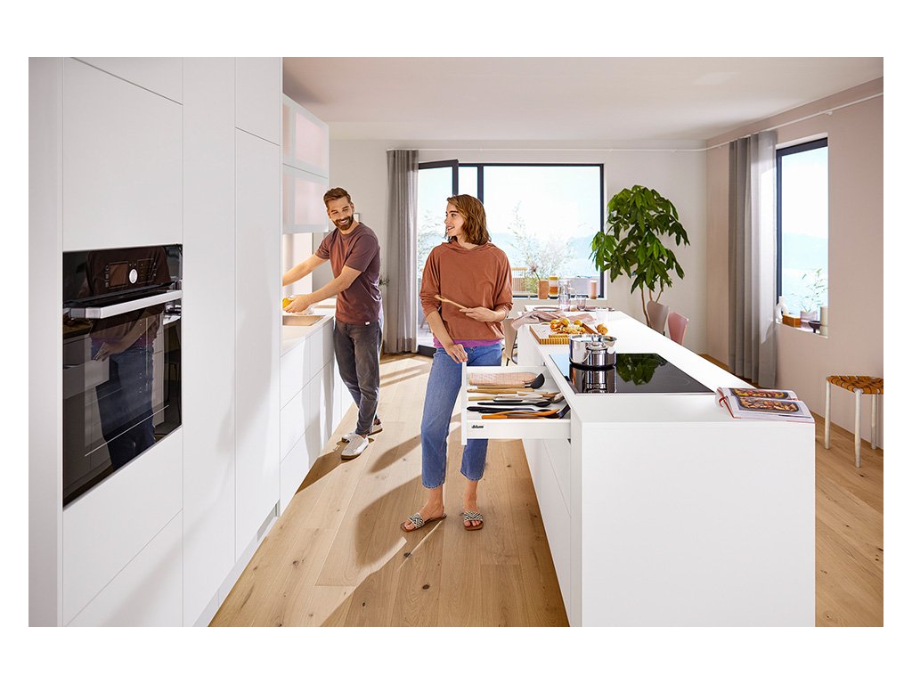 Súprava obsahuje kovanie na montáž jednej tlmenej zásuvky Blumotion vrátane príslušného čelného kovania.