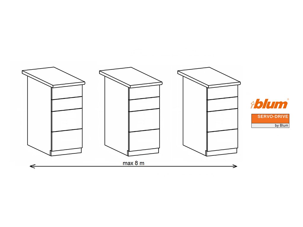 Sada ServoDrive pre 3 korpusy/12 zásuviek/max. výšky korpusu 1170mm.Maximálna vzdialenosť krajných korpusov medzi sebou 8 m Sada obsahuje všetky potrebné SERVO-DRIVE komponenty pre zostavenie funkčného elektricky bezúchytkovo otvaracieho nábytku (použitelné pre Antaro. ✅ Legrabox ✅ Tandem a Movento) Výsuvy pre kombináciu se SERVO-DRIVE použite tlumené.