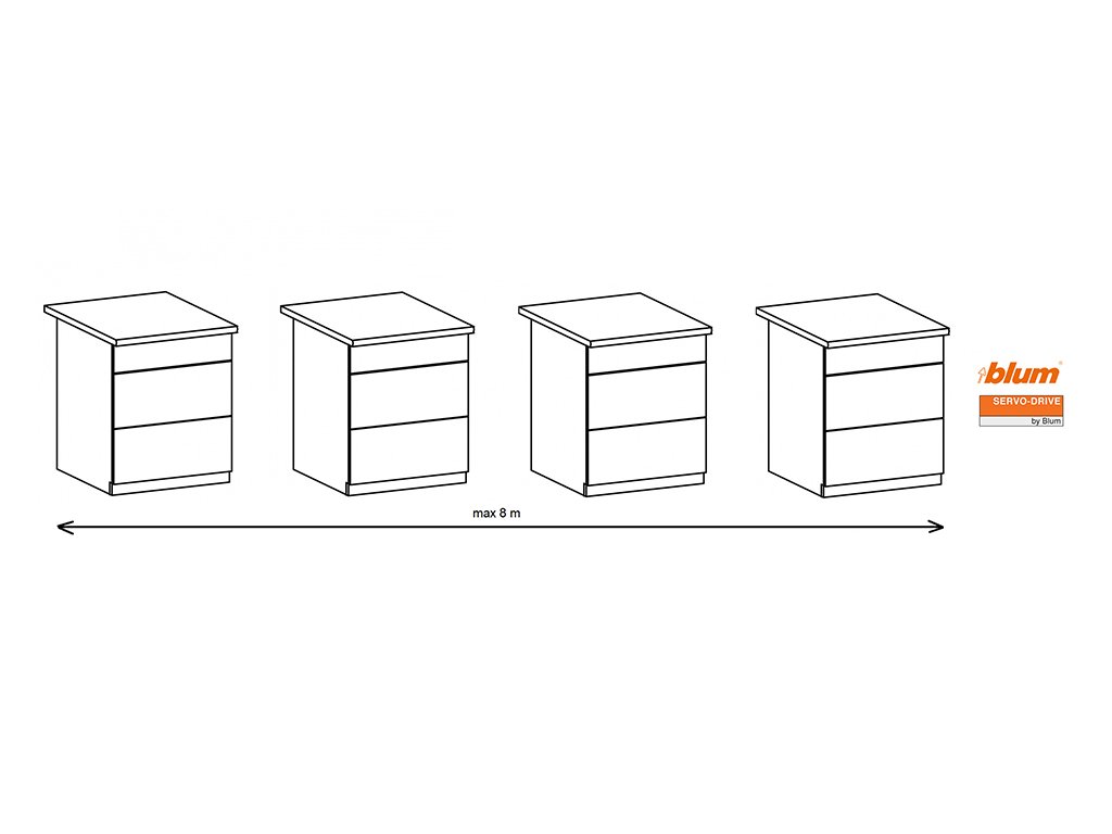 Sada ServoDrive pre 4 korpusy/12 zásuviek/max. výšky korpusu 750mm.Maximalna vzdialenosť krajných korpusov medzi sebou 8 m Sada obsahuje všetky potrebné SERVO-DRIVE komponenty pre zostavenie funkčného elektricky bezúchytkovo otvaracieho nábytku (použitelné pre Antaro. ✅ Legrabox ✅ Tandem a Movento) Výsuvy pre kombináciu se SERVO-DRIVE použite tlumené.