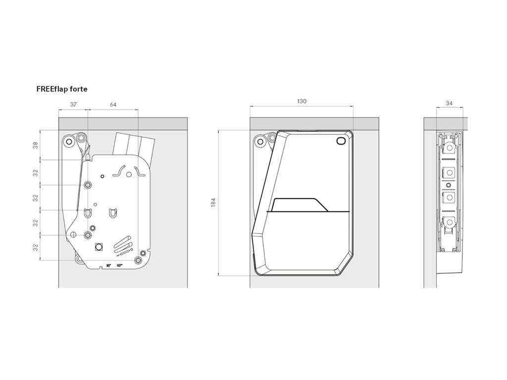 Výklopné kovanie so zamatovým pohybom a jednoduchou montážou. Uhol otvorenia 107°. Sada obsahuje pár výklopov, krytky šedej farby, čelné kovanie. Podľa váhy a výšky čela určíte vhodnú silu výklopu. Pre výšku čela 350mm a váhu 10,1 - 21,4kg. Pre výšku čela 375mm a váhu 9,4 - 19,8kg. Pre výšku čela 400mm a váhu 8,9 - 18,6kg. Pre výšku čela 425mm a váhu 8,3 - 17,4kg. Pre výšku čela 450mm a váhu 7,8 - 16,3kg. Pre výšku čela 475mm a váhu 7,4 - 15,4kg. Pre výšku čela 500mm a váhu 7,0 - 14,6kg. Pre výšku čela 525mm a váhu 6,6 - 13,9kg. Pre výšku čela 550mm a váhu 6,3 - 13,2kg. Pre výšku čela 575mm a váhu 6,0 - 12,5kg. Pre výšku čela 600mm a váhu 5,7 - 12,0kg. Pre výšku čela 625mm a váhu 5,4 - 11,5kg. Pre výšku čela 650mm a váhu 5,3 - 11,0kg. Okrem elektrického systému eTouch možno na bezúchytkové otváranie použiť aj piesty PTO, výber a dimenzovanie nájdete v súvisiacich dokumentoch. Dvere sa po stlačení otvoria na dĺžku piestu a potom ich možno uchopiť rukou a otvoriť do požadovanej polohy. FREEflap videomanual.