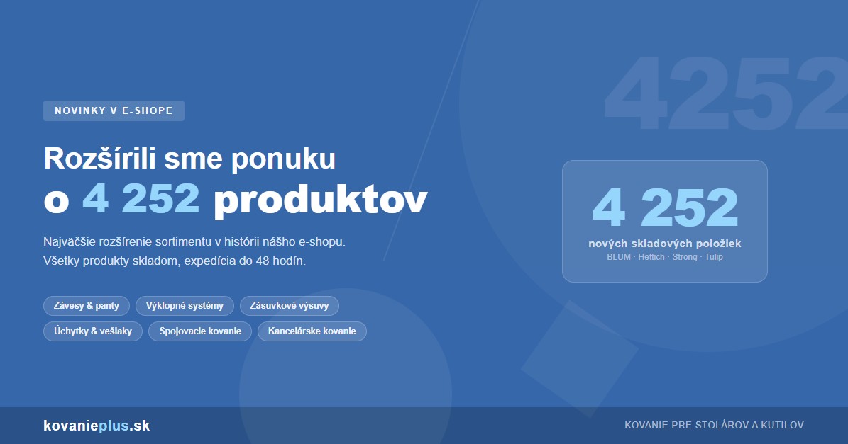 Zásadne sme posilnili ponuku miskovitých závesov, výklopného kovania a systémov pre posuvné dvere. Nájdete tu rozsiahlu kolekciu od firiem Blum (vrátane systémov Clip Top, Blumotion a Servo-Drive) a Hettich — výrobcov, ktorým stolári a truhláři na Slovensku dôverujú a spoliehajú sa na ne.
