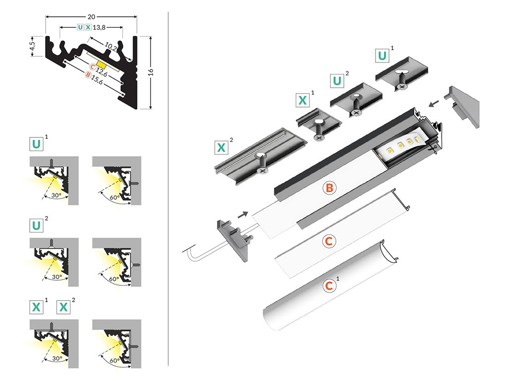 Profil rohový. ALU profil pre LED písiky s uhlom svitu 30°/60°(podľa natočenia). Nutné doobjednať kryciu lištu (mliečna-130642. ✅ Priesvitná-130645 ✅ Pologuľatá-130648) ✅ Naklapávacia krycia lišta transparentná -198516 alebo mliečna - 221008