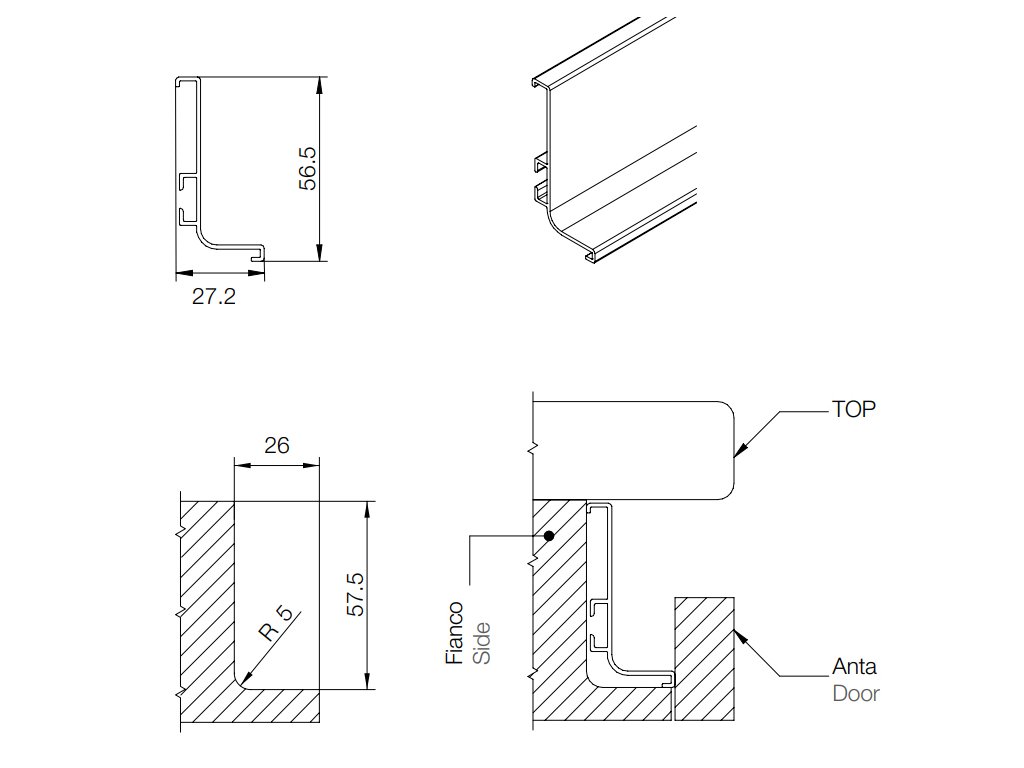 Horizontálny profil Gola J pre aplikáciu medzi zásuvky (šuflíky).