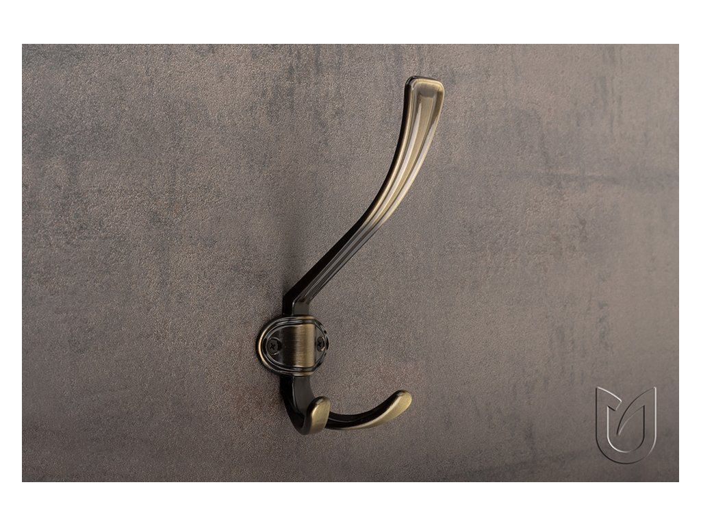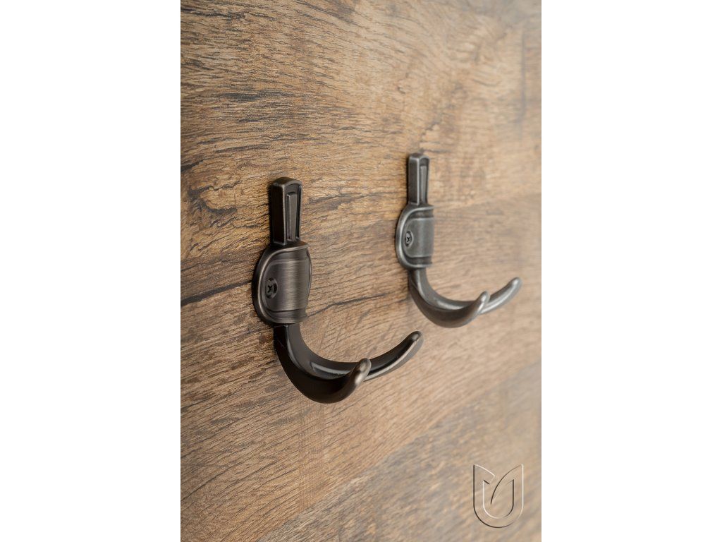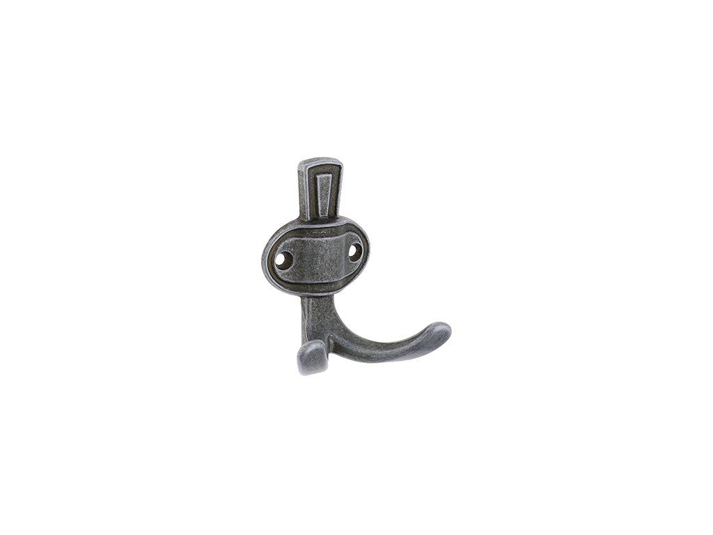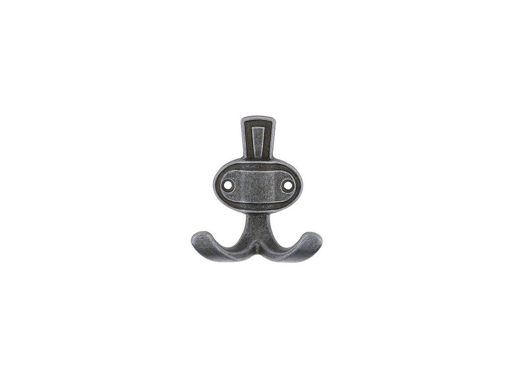 vešiak šírka 65 mm, výška 76, dĺžka 45 mm, povrch patinovaný kov.