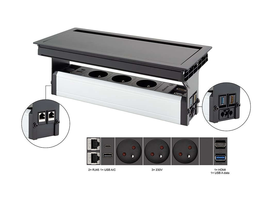 VersaFlap Mono 2.0, 3x 230V, 2x RJ45, 1xHDMI, 1xUSB A/C, 1xUSB data, elox hliník