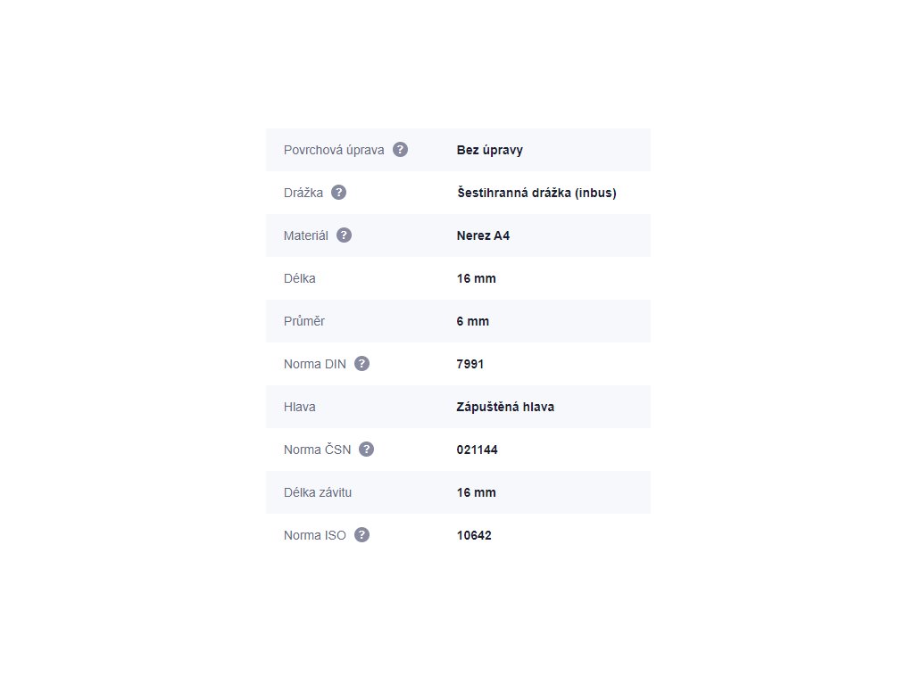 Skrutky imbusové DIN 7991, zapustená hlava, vnútorný šesťhran, nerez, rozmer M6 x 16, A4 pre WC kabinky k uchyteniu dosky hrúbky 18mm.